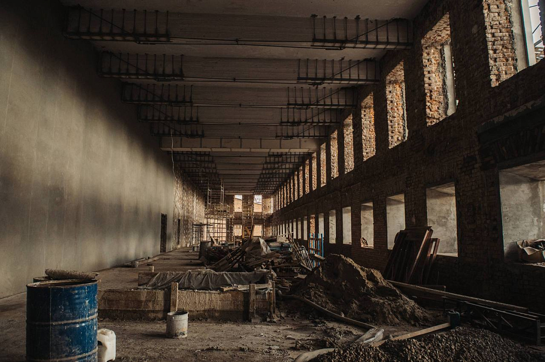 На сегодняшний день подрядчик занимается восстановлением фасада, в ближайшее время приступит к установке окон на первом этаже и завершит закрытие теплового контура. На верхних этажах установлены необходимые перегородки, ведутся штукатурные работы, закрытие контура системы вентиляции, а также подготовка к запуску отопления.