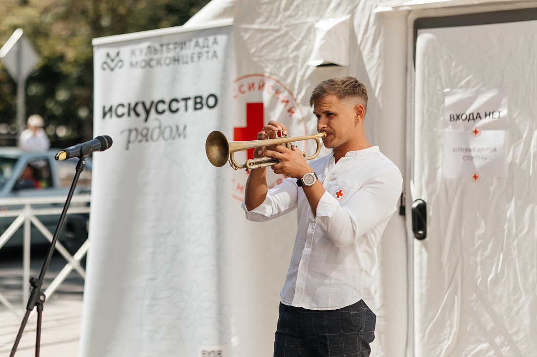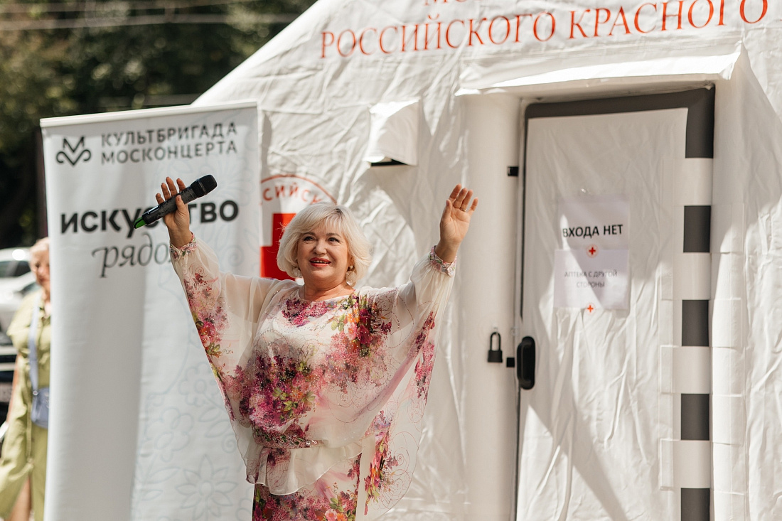 В мобильном пункте выдачи гуманитарной помощи Российского Красного Креста артисты культбригады Москонцерта совместно с генеральным директором Ильёй Бачуриным и Курской государственной филармонией представили концертную программу для жителей приграничья, заселившихся в пункты временного размещения.
