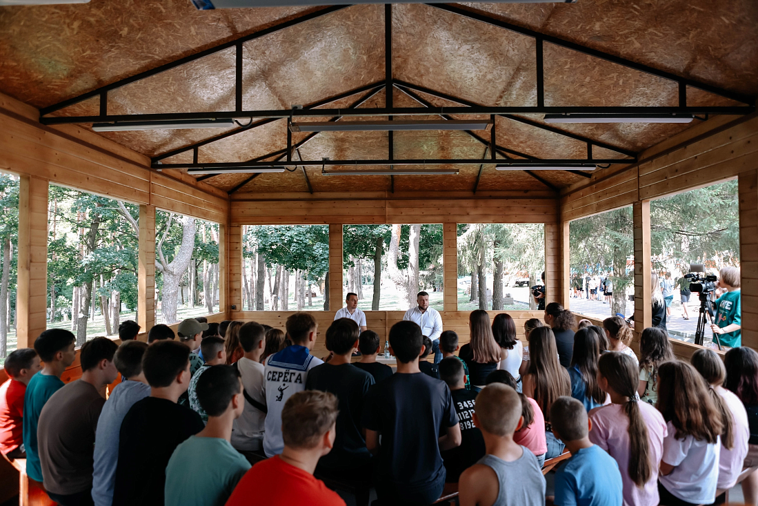 В Курской области на базе санатория «Соловушка» прошла встреча врио заместителя Председателя Правительства – министра внутренней и молодежной политики Курской области Евгения Лобова с детьми из Мангушского муниципального округа.