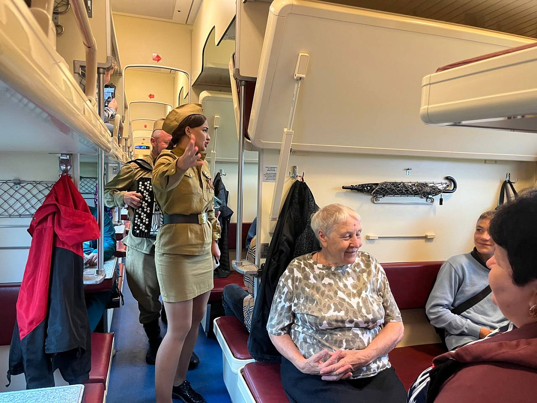 Пассажирами Поезда Победы стали ветераны-железнодорожники, участники специальной военной операции, жители курского приграничья. В вагонах звучат песни, посвященные Великой Отечественной войне. На каждой станции проходят торжественные митинги, участники акции также возлагают цветы к Вечному огню в знак глубокого уважения к подвигу советских воинов.
