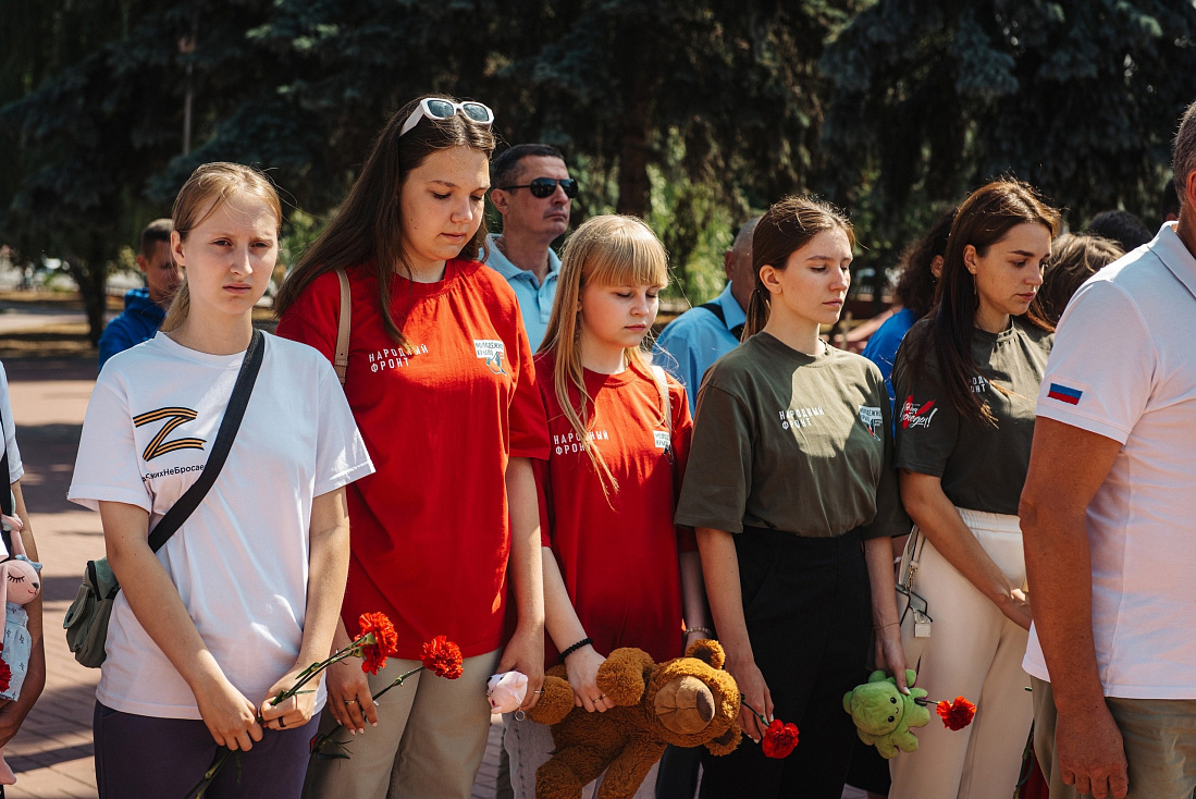 В сквере состоялась церемония возложения цветов и игрушек. В ходе мероприятия прозвучали имена и истории погибших детей. Память о них почтили минутой молчания.