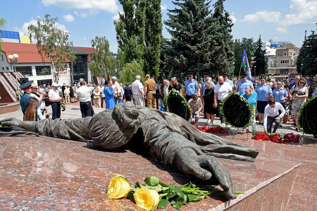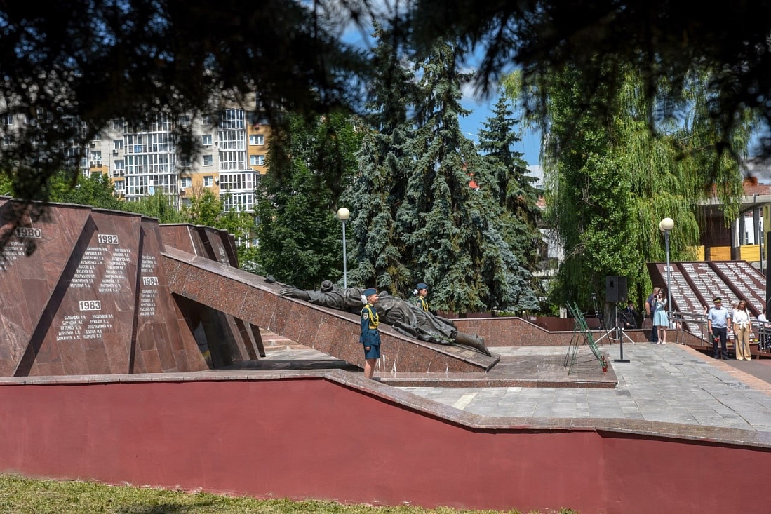 В Георгиевском сквере Курска состоялась церемония возложения цветов и венков к памятнику «Скорбящая мать», приуроченная ко Дню ветеранов боевых действий.