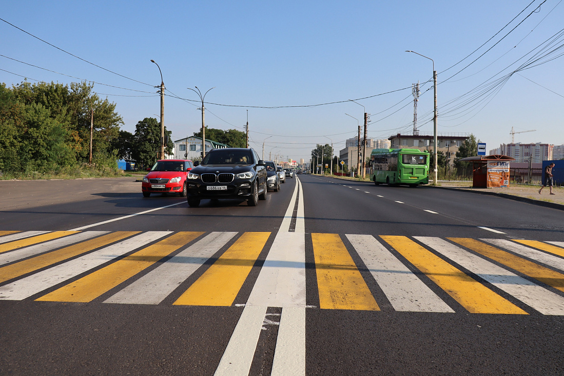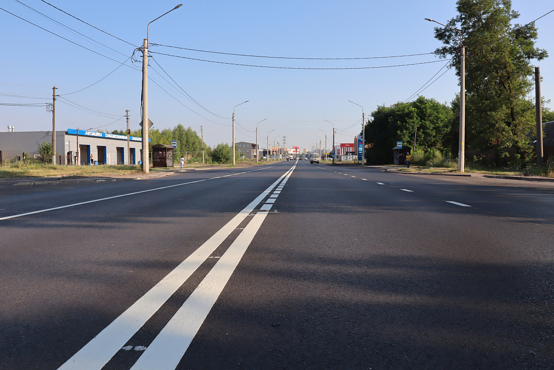 В процессе ремонта подрядчики выполнили устройство слоев покрытия из асфальтобетона по основному ходу дороги и тротуару, установили бортовой камень, а также восстановили съезды, уширения и заездные карманы.