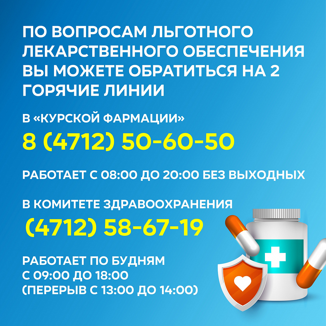 По вопросам льготного лекарственного обеспечения можно звонить на две горячие линии. Одна работает в «Курской фармации» по телефону 50-60-50, специалисты ответят с 08:00 до 20:00, без выходных. Вторая линия организована в областном комитете здравоохранения по телефону 8 (4712) 58-67-19 и действует с понедельника по пятницу с 09:00 до 18:00 (перерыв с 13:00 до 14:00).