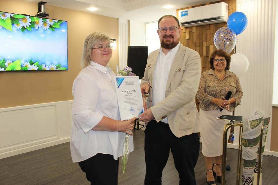 Врио министра информации и общественных коммуникаций Курской области Олег Ведутов вручил благодарственное письмо и начальнику Курского почтамта Галине Торкиани.