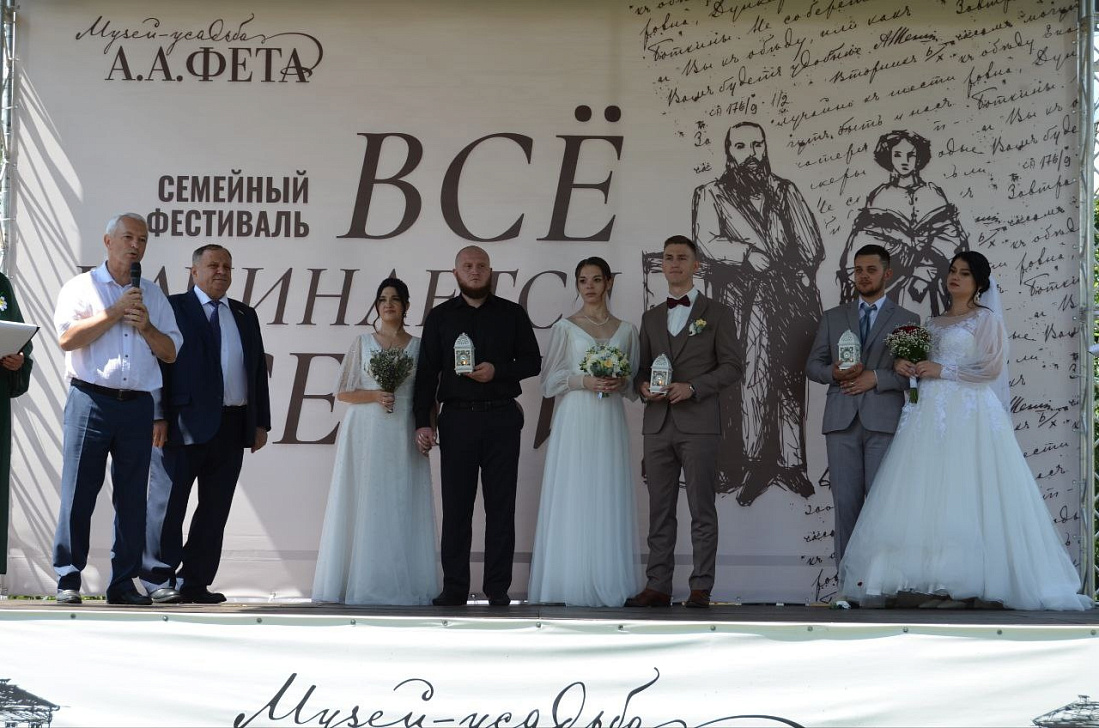 В музее «Усадьба А.А. Фета» прошел первый семейный фестиваль «Все начинается с семьи». Он приурочен к Году семьи в России. Мероприятие открыл врио заместителя председателя правительства – министра внутренней и молодежной политики Курской области Евгений Лобов.Фестиваль начали с выездной регистрации брака трех пар. Теперь для молодоженов ее могут провести на территории музея-усадьбы, место для выездной регистрации можно выбрать из специального перечня при подаче заявления в ЗАГСе. Свидетельства о заключении брака молодым семьям вручила врио председателя комитета ЗАГС Курской области Ольга Воробьева.