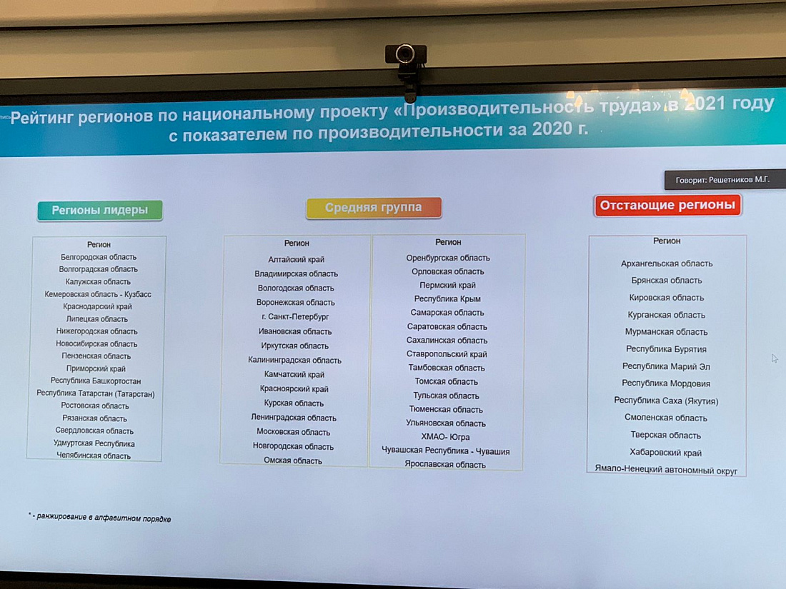 Участники совещания обсудили механизмы стимулирования и мотивации регионов при реализации нацпроекта, а также рейтинг субъектов с конкретными успешными практиками повышения производительности труда.