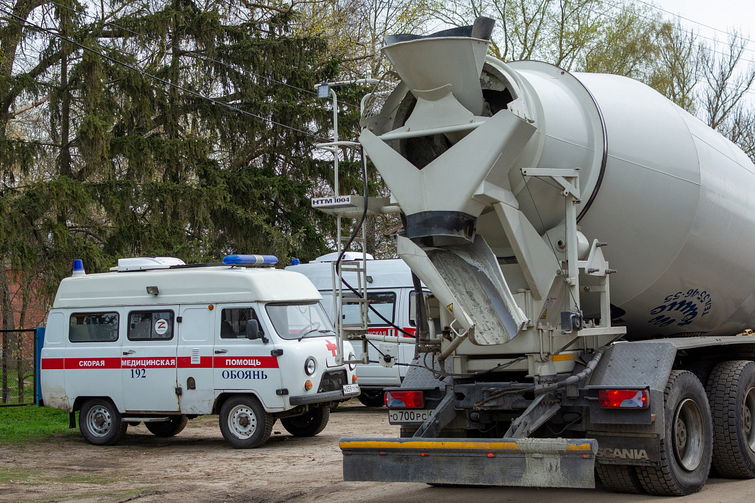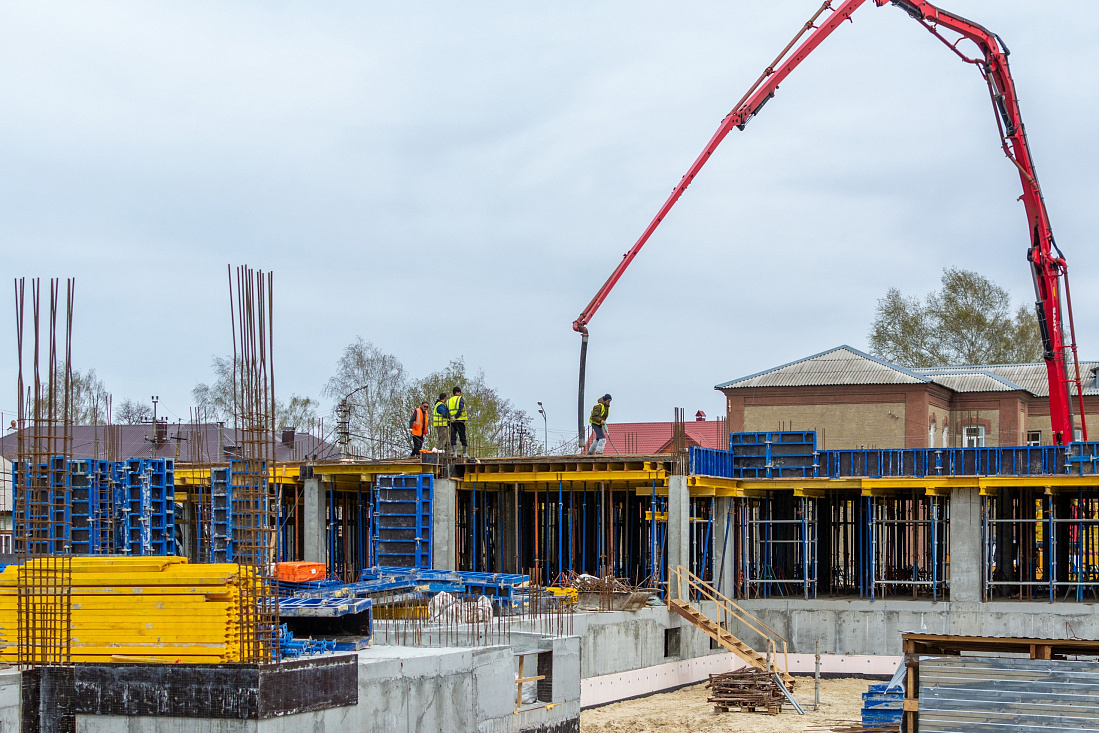 В Обояни продолжается строительство взрослой поликлиники. Рабочие полностью закончили монолитное перекрытие, бетонирование стен и устройство кирпичных перегородок подвала. Одновременно возводятся монолитное перекрытие первого этажа и наружные стены, подводятся внешние коммуникации.