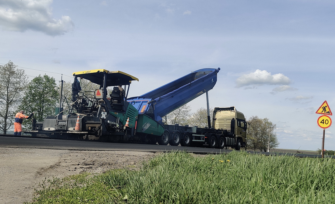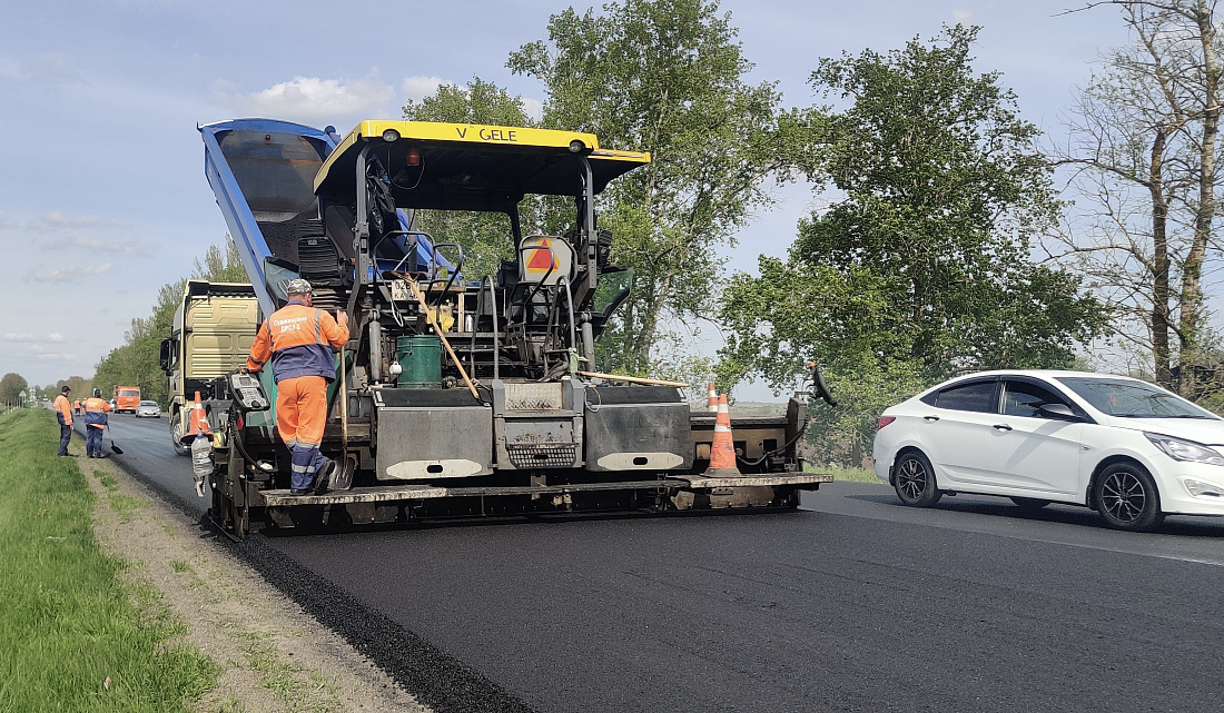 Ранее специалисты провели фрезерование участка этой трассы. После снятия старого дорожного покрытия и проведения ряда подготовительных работ специалисты приступили к укладке нового покрытия в два слоя.