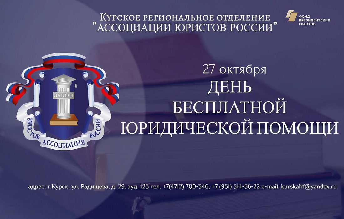 27 октября в Курском региональном отделении Ассоциации юристов России пройдет очередной День бесплатной юридической помощи.