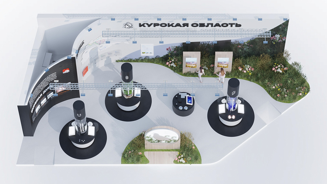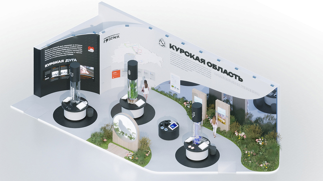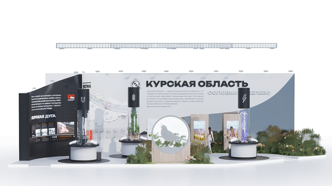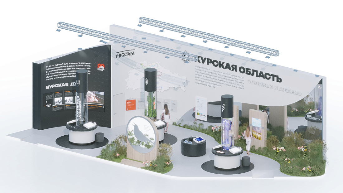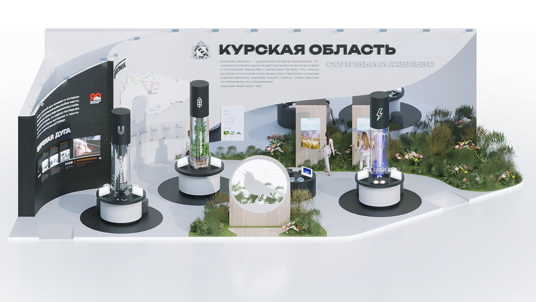 Это сочетание найдет отражение в экспозиции. На колоннах под названиями «Магнитная аномалия», «Чернозем» и «Мирный атом» разместят информацию о достижениях промышленности, энергетики и сельского хозяйства. Другая часть стенда, оформленная с использованием натуральных материалов, расскажет о природе края и его великих творцах.