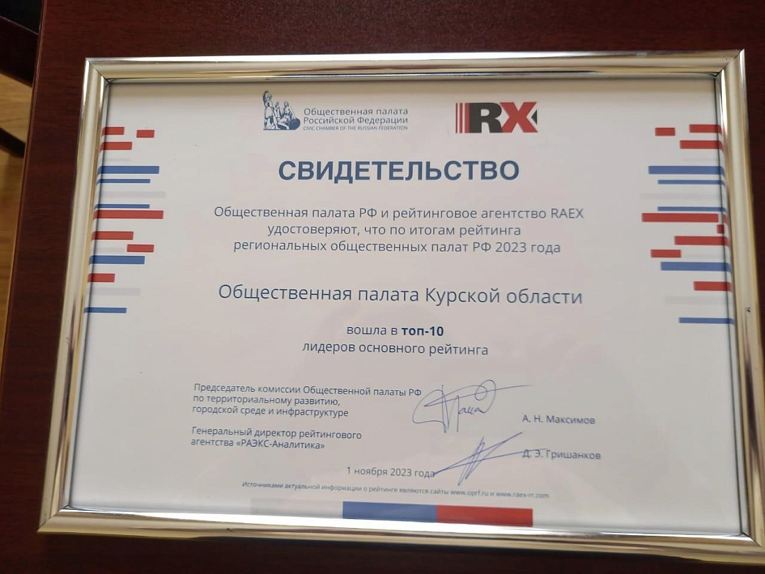 По итогам рейтинга региональных общественных палат РФ 2023 года Общественная палата Курской области вошла в топ-10 лидеров. Рейтинг подготовлен агентством RAEX и Общественной палатой Российской Федерации.