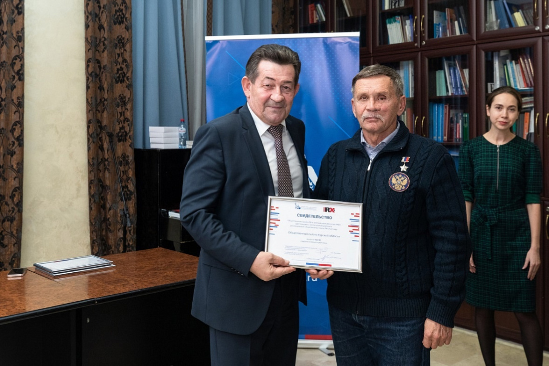 На заседании Совета общественных палат России первый заместитель секретаря Общественной палаты Российской Федерации, Герой России Вячеслав Бочаров вручил председателю Общественной палаты Курской области Алексею Лазареву соответствующее свидетельство.