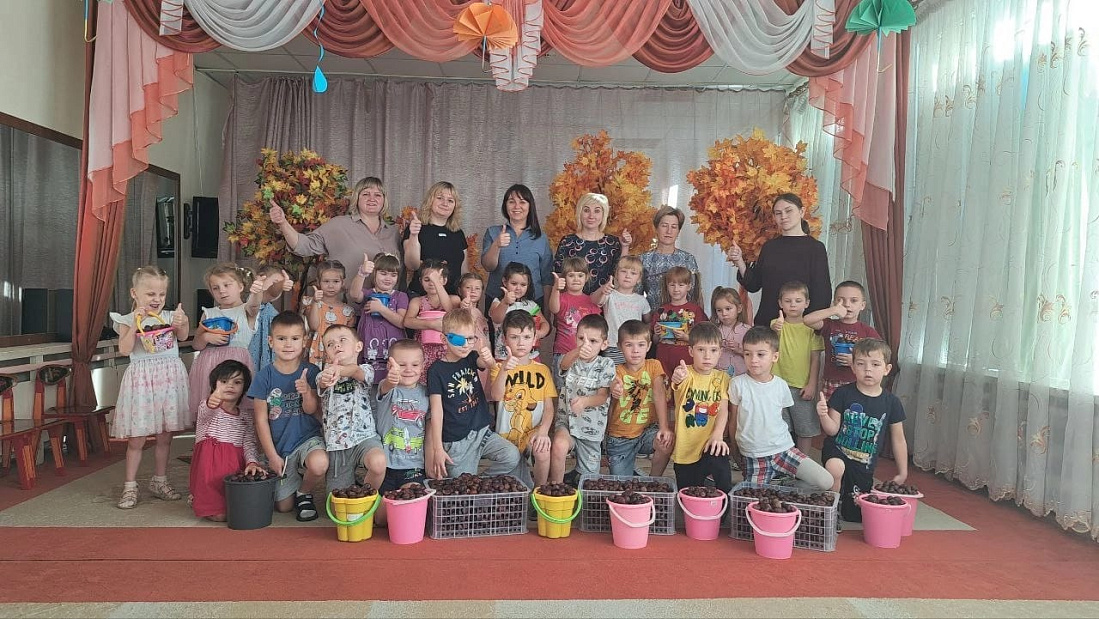 Кроме того, воспитанники детского сада приняли активное участие в сборе каштана, они заранее подготовили более 100 кг и передали их в Курское лесничество.