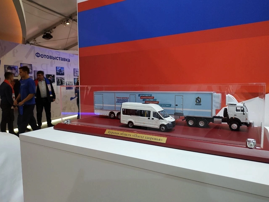 Посетителям представлен макет Поезда здоровья из Курской области. Мобильный медицинский комплекс «МЕДКАР» приобретен в марте 2023 года. На его закупку из областного бюджета было выделено 52 млн рублей. Это передвижная поликлиника с кабинетами для приема пациентов и современным оборудованием.
