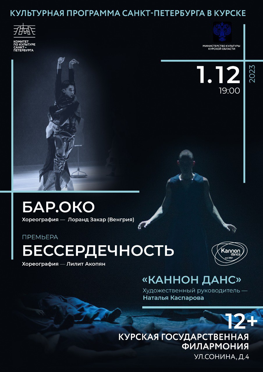 Также 1 декабря в концертном зале «Свиридовский» выступят артисты Санкт-Петербургской танцевальной компании «Каннон Данс». Зрителям представят два одноактных балета «Бар.Око» и «Бессердечность». Театр современного танца «Каннон Данс» был основан Натальей и Вадимом Каспаровыми в 1997 году, за эти годы в нем было воспитано несколько поколений хореографов и артистов.