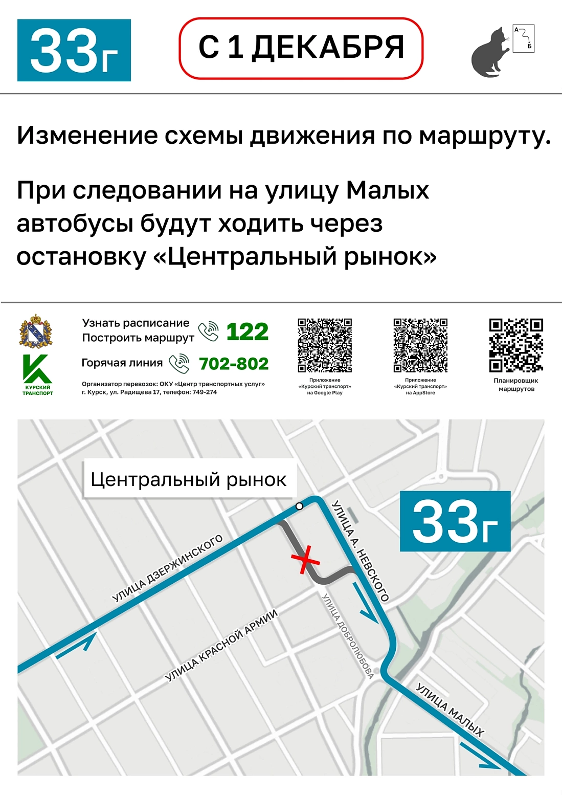 Городской маршрут 33г будет проходить через остановку «Центральный рынок» при следовании на улицу Малых. Автобусы по маршруту 41 теперь будут ездить по улице Крымской в обоих направлениях.