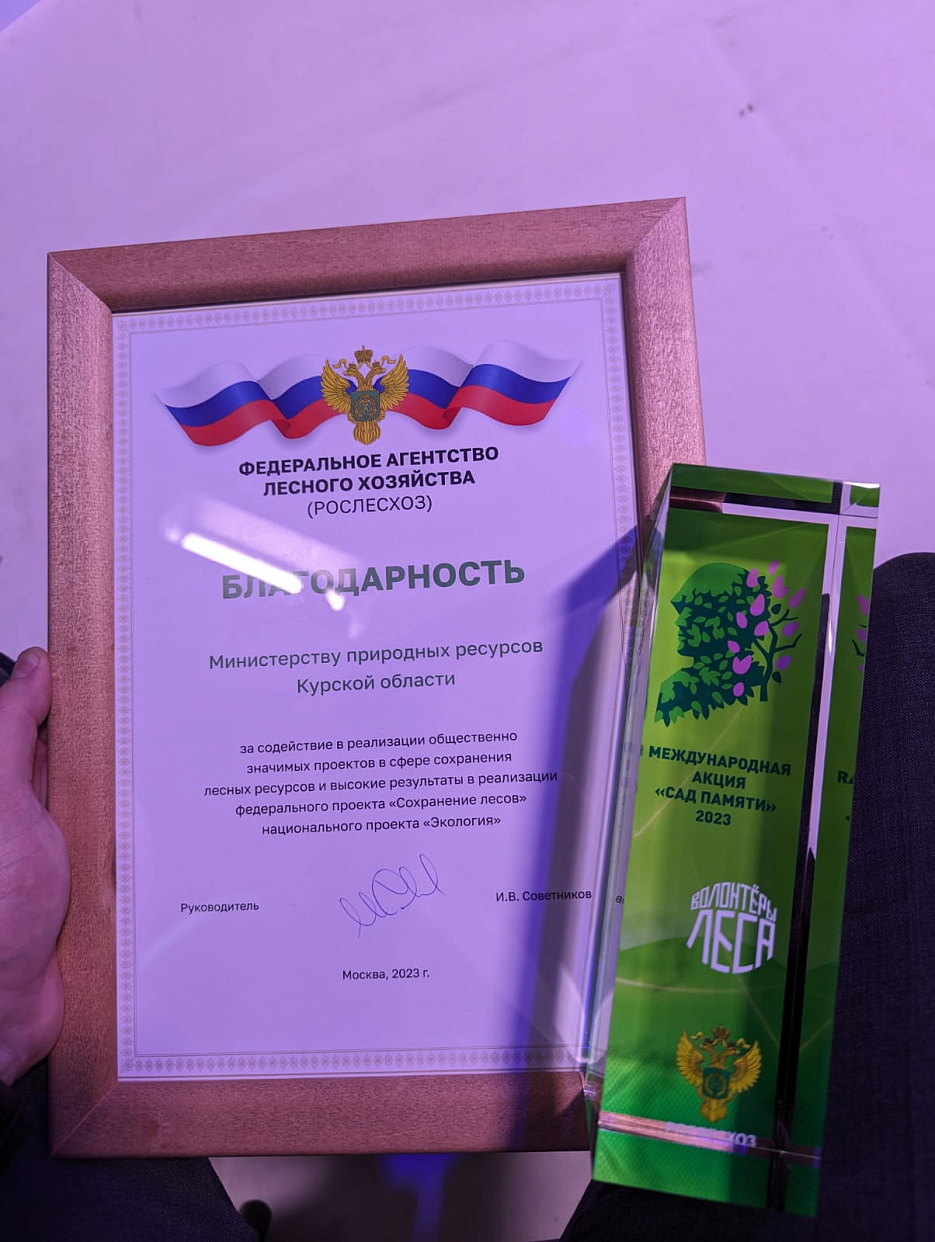 В этом году в рамках центрального мероприятия акции «Сад Памяти», проходившей при поддержке Фонда президентских грантов, был высажен геоглиф «80 лет Победы в Курской битве» в Фатежском районе. Еще один - «Мы Вместе», создан в подшефном Мангушском районе ДНР. Проведенную регионом работу высоко оценили: Курская область получила благодарность за реализацию общественно значимых проектов в сфере сохранения лесных ресурсов и высокие результаты в реализации федерального проекта «Сохранение лесов» нацпроекта «Экология».