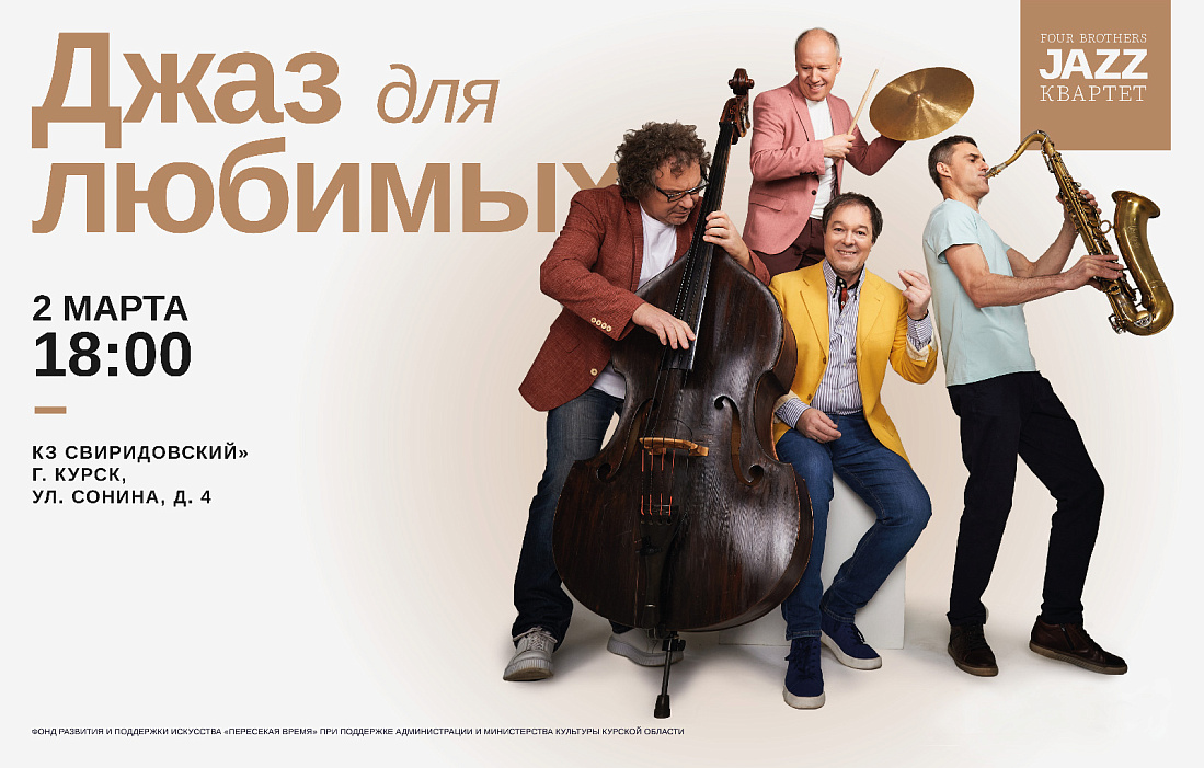 Заслуженные артисты России братья Михаил и Андрей Ивановы представят в Курске авторскую программу My Russian Heart. В концертном зале «Свиридовский» 2 марта для ценителей джазовой и импровизационной музыки выступит джаз-квартет FOUR BROTHERS.