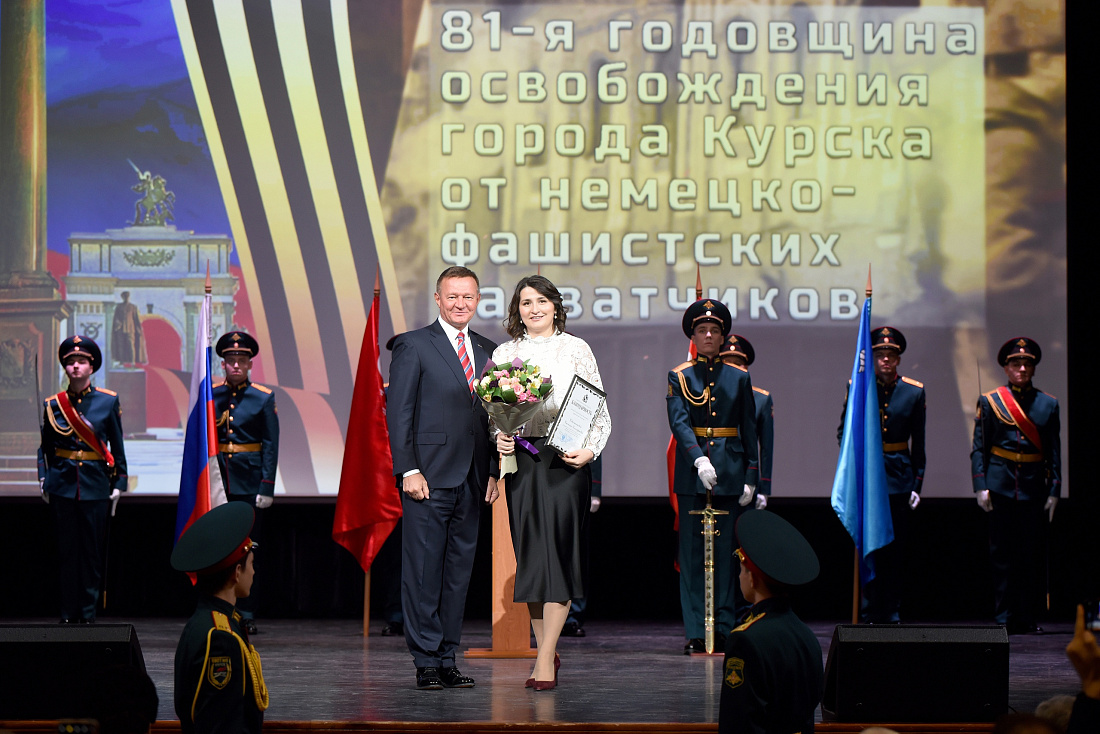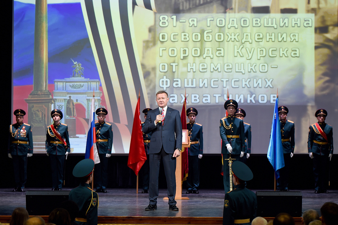 В Курской государственной филармонии прошло торжественности собрание, посвящённое годовщине освобождения областного центра. На нём присутствовали представители исполнительных и законодательных органов власти, Курской епархии, жители города, принимающие активное участие в военно-патриотическом воспитании подрастающего поколения.
