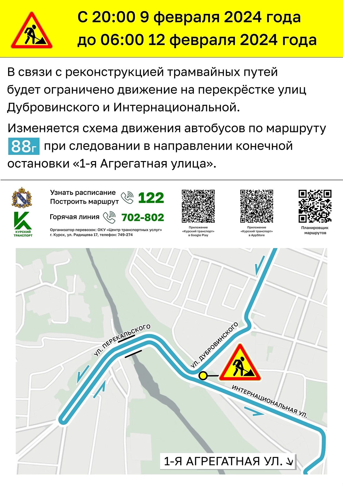 На перекрестке улиц Дубровинского и Интернациональной движение будет ограничено с 20:00 9 февраля до 06:00 12 февраля. Это повлияет на схему движения автобусов по маршруту 88г при следовании в направлении конечной остановки «1-я Агрегатная улица».