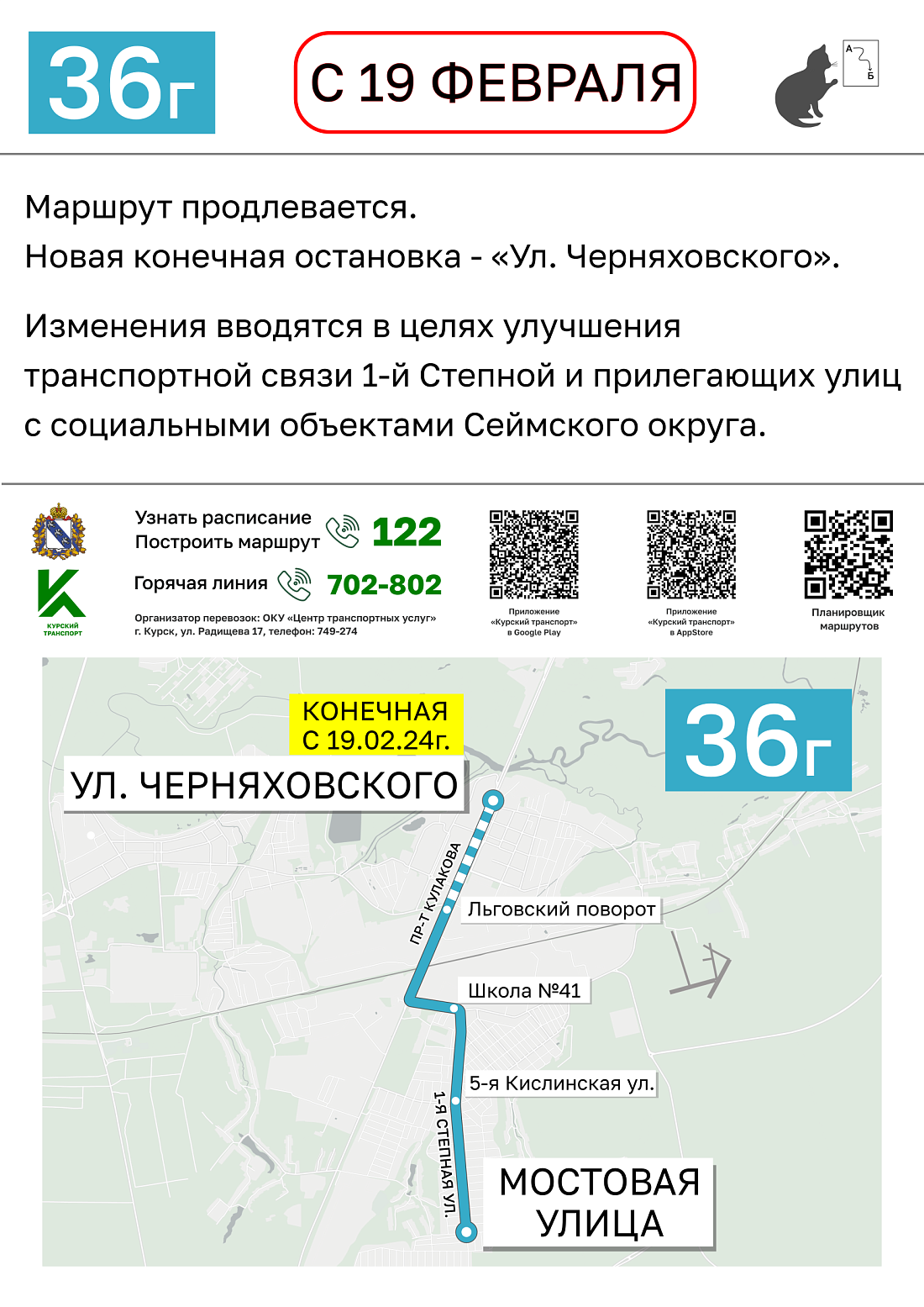 Новая конечная остановка городского автобусного маршрута 36г – «Ул. Черняховского». Изменения вводятся в целях улучшения транспортной связи 1-й Степной и прилегающих улиц с социальными объектами Сеймского округа.