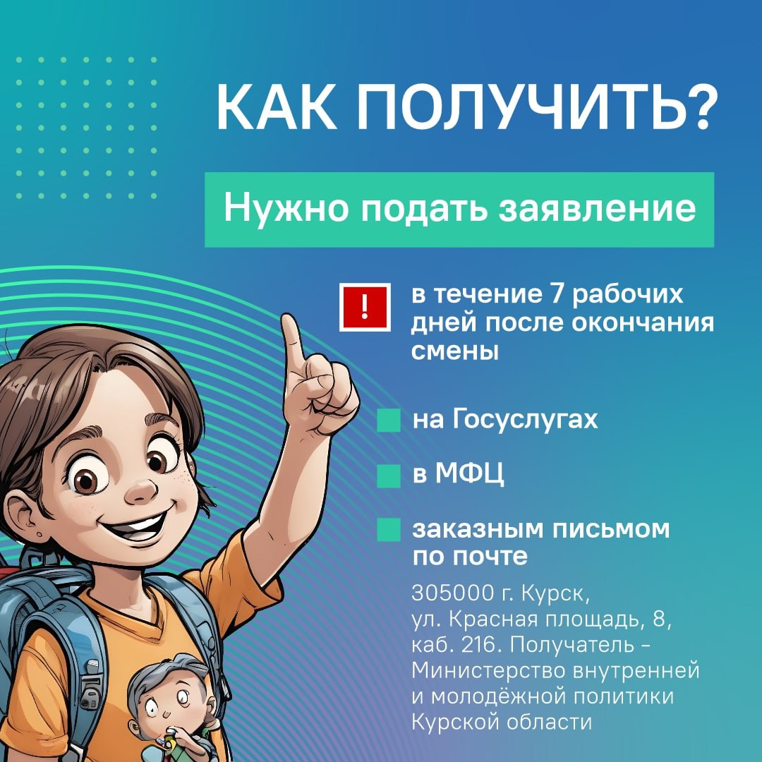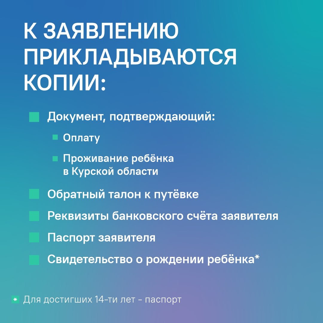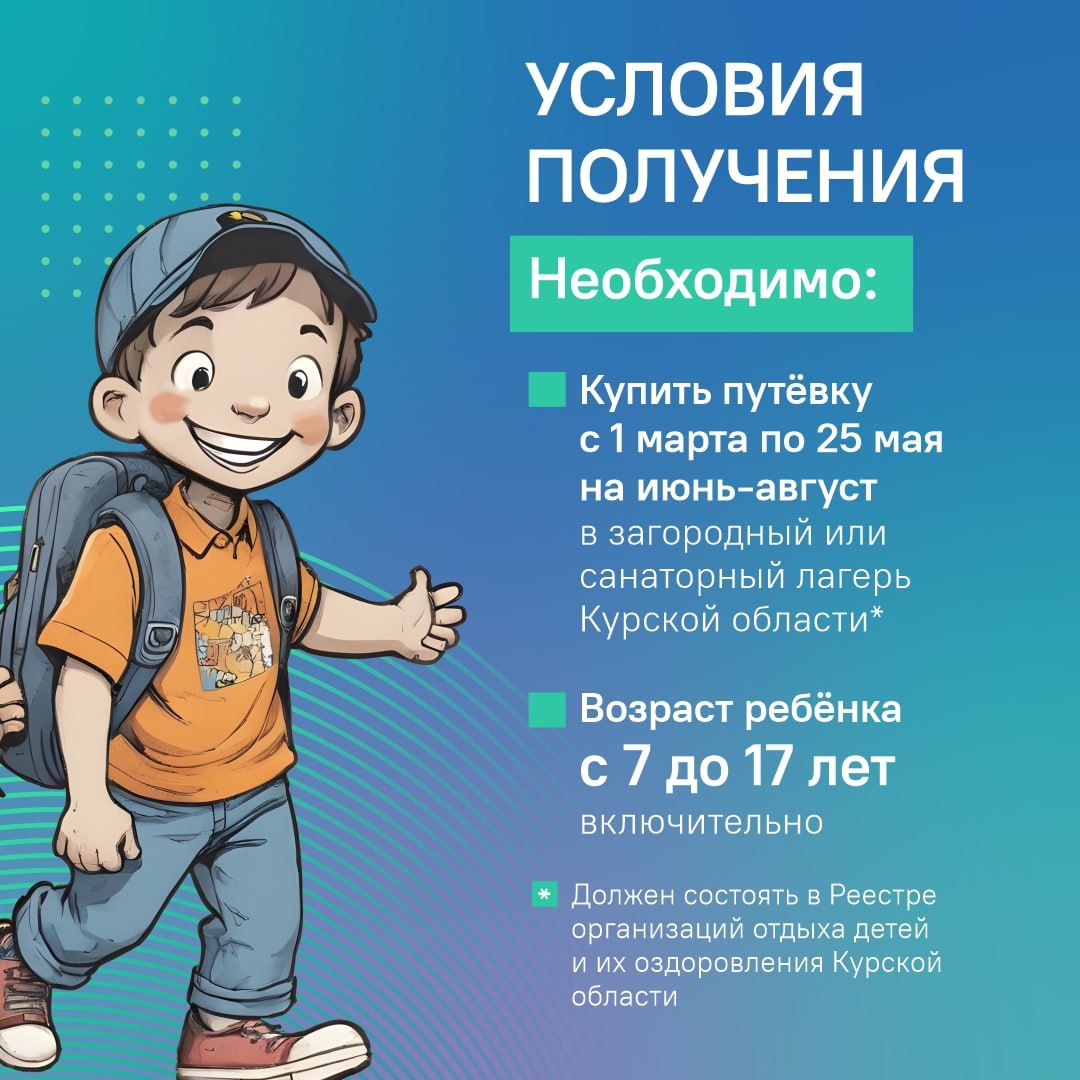 Для этого необходимо с 1 марта по 25 мая купить путевку на летние каникулы для своего ребенка в возрасте от 7 до 17 лет включительно в загородный или санаторный лагерь региона. Детское учреждение должно быть внесено в Реестр организаций отдыха детей и их оздоровления Курской области.
