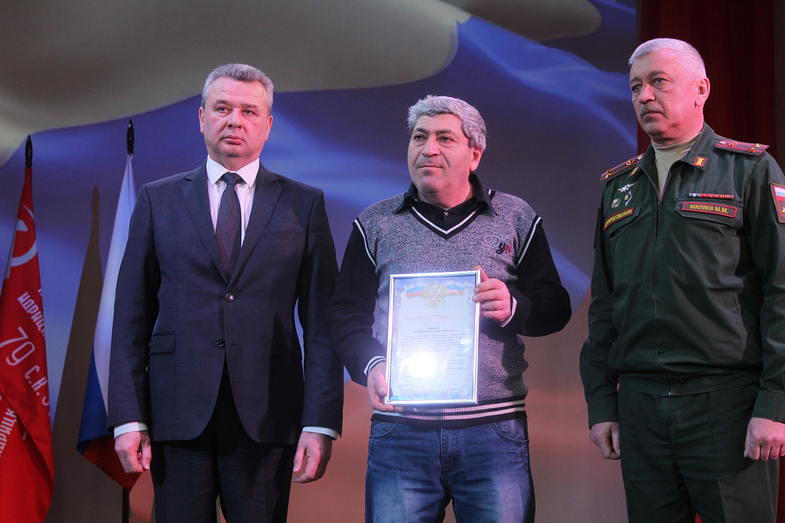 В Медвенском районе в рамках торжественного мероприятия, посвященного Дню защитника Отечества, заместитель министра внутренней и молодежной политики региона Борис Бышов и военный комиссар Медвенского района Максим Миляев вручили благодарственное письмо командира войсковой части родителям военного Армена Акопяна. Теплые слова о сыне адресованы Мгеру и Эрикназ Акопянам.