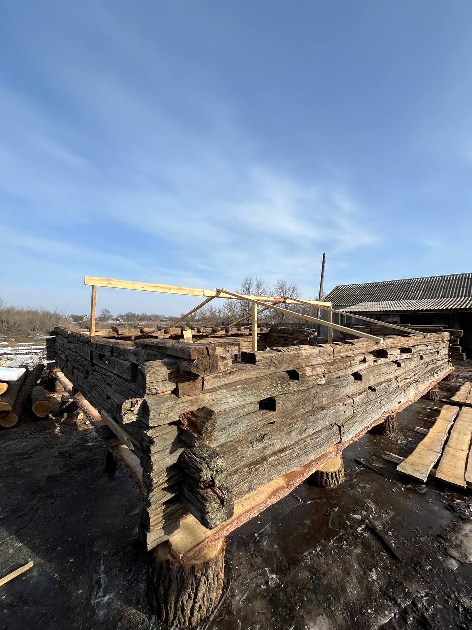 В настоящее время выполнен пробный сбор части сруба с отреставрированными и замененными бревнами.