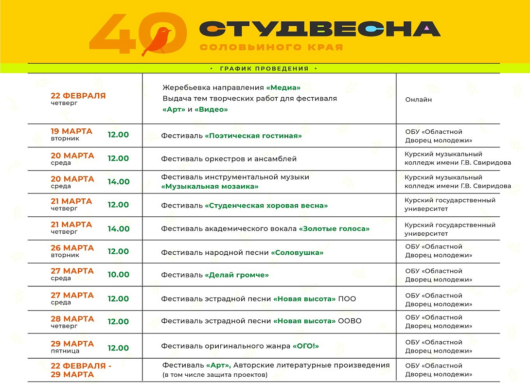В Курской области стартует юбилейный 40-й областной фестиваль студенческого творчества «Студенческая весна Соловьиного края». В 2024 году он посвящен Году семьи в Российской Федерации.