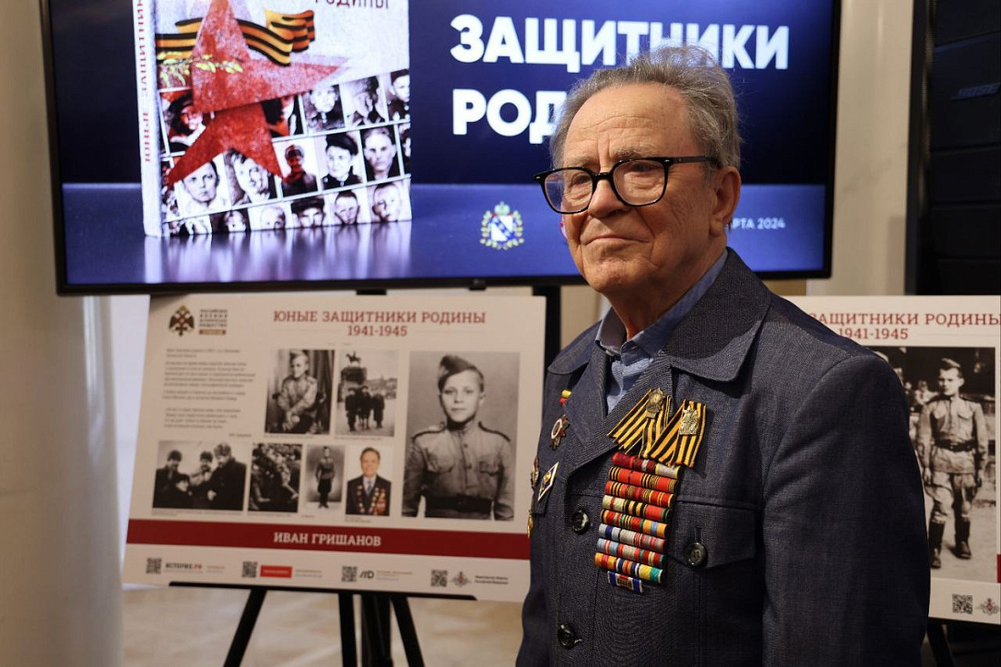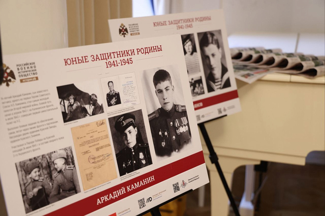 Кроме того, гостям мероприятия была представлена одноименная стендовая выставка РВИО «Юные защитники Родины». Она создана Российским военно-историческим обществом совместно с музеем «Юные защитники Родины» – филиалом Курского областного краеведческого музея. Один из героев выставки - ветеран Великой Отечественной войны, поэт-фронтовик, участник Курской битвы Иван Гришанов.