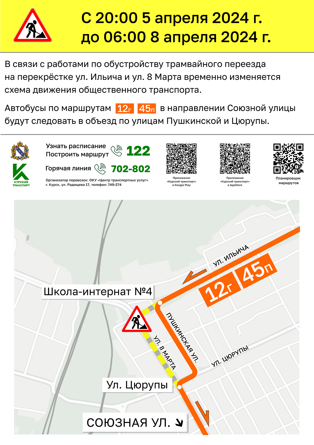 В связи с проведением компанией «Мовиста Регионы Курск» работ по устройству трамвайного переезда на перекрестке улиц Ильича и 8 Марта временно изменяется схема движения общественного транспорта.