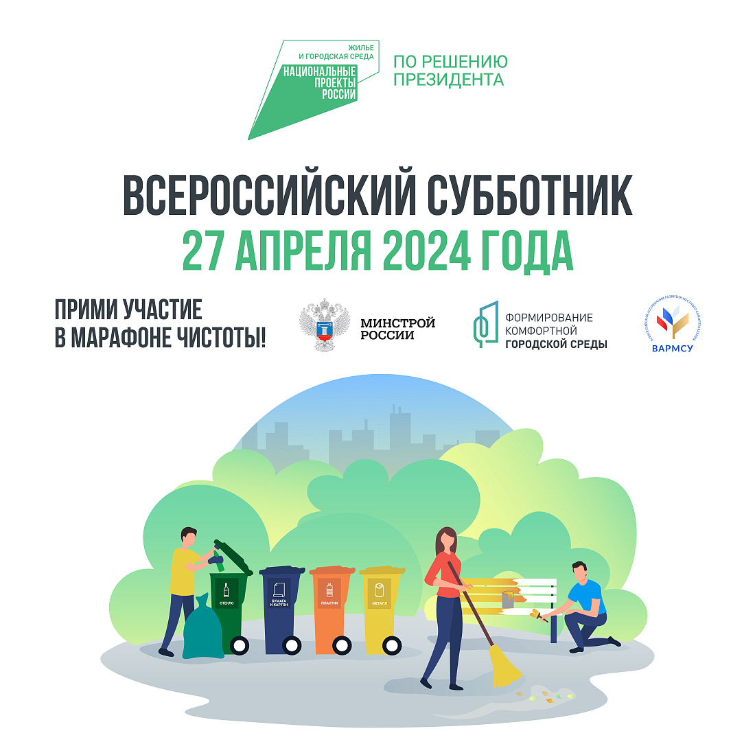 Всероссийский субботник проводится в рамках федерального проекта «Формирование комфортной городской среды» национального проекта «Жилье и городская среда», одна из задач которого - вовлечение жителей в принятие решений по вопросам благоустройства территорий.