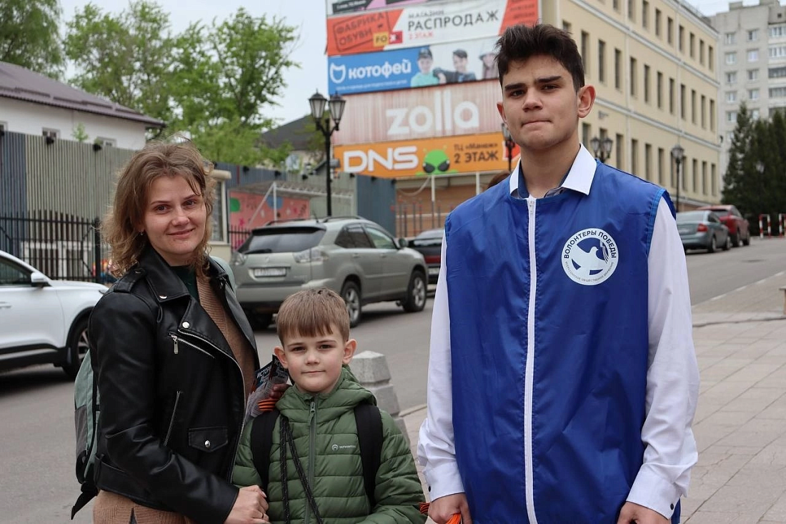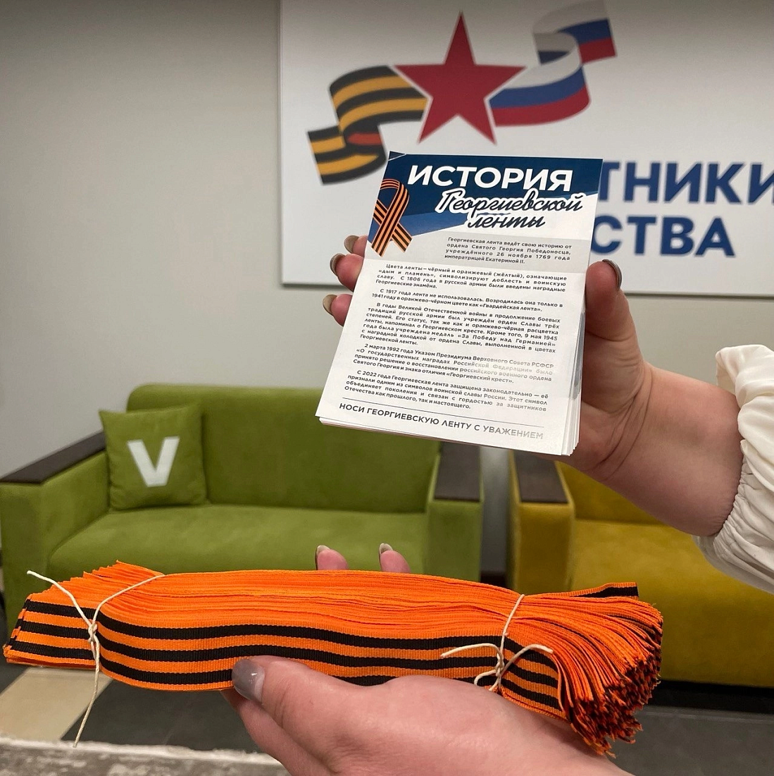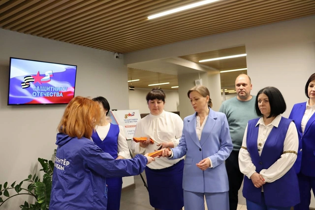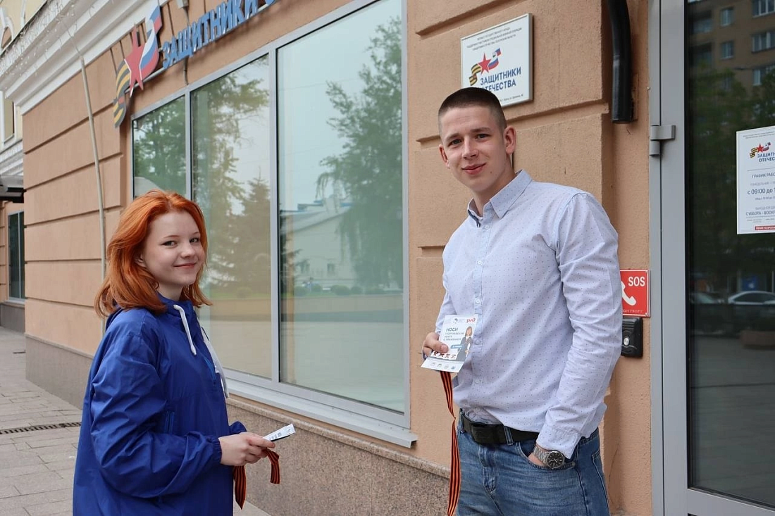 «Волонтеры Победы» совместно с курским филиалом фонда «Защитники Отечества» дали старт акции «Георгиевская ленточка». Она традиционно проводится в преддверии Дня Победы начиная с 2005 года. Участники раздали у входа в фонд ленту — символ Победы — прохожим, социальным координаторам и посетителям.