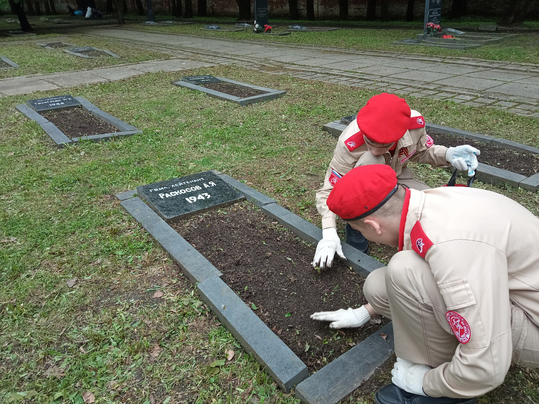 Ребята из юнармейских отрядов приводят в порядок памятники погибшим воинам, братские могилы и могилы участников Великой Отечественной войны, памятные знаки. На территории захоронений они проводят уборку, при необходимости освежают краску. Также юнармейцы устанавливают государственные флаги, возлагают цветы к местам захоронения погибших бойцов.
