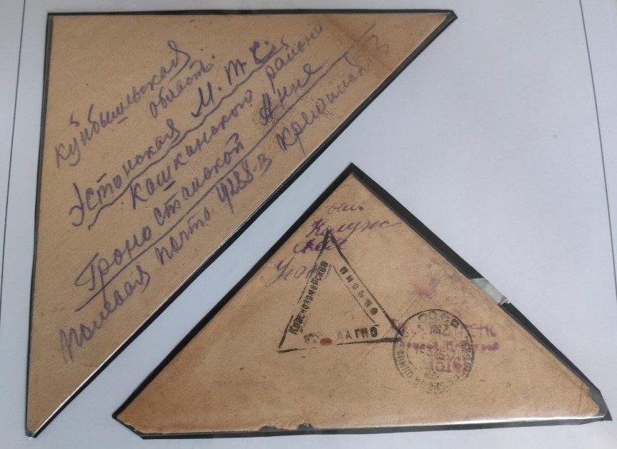 В экспозиции также представлены конверты с ответами Финансового управления при Министерстве обороны СССР на запросы граждан о судьбе своих близких, а также письма-треугольники, отправленные из действующей армии в различные города Советского Союза.