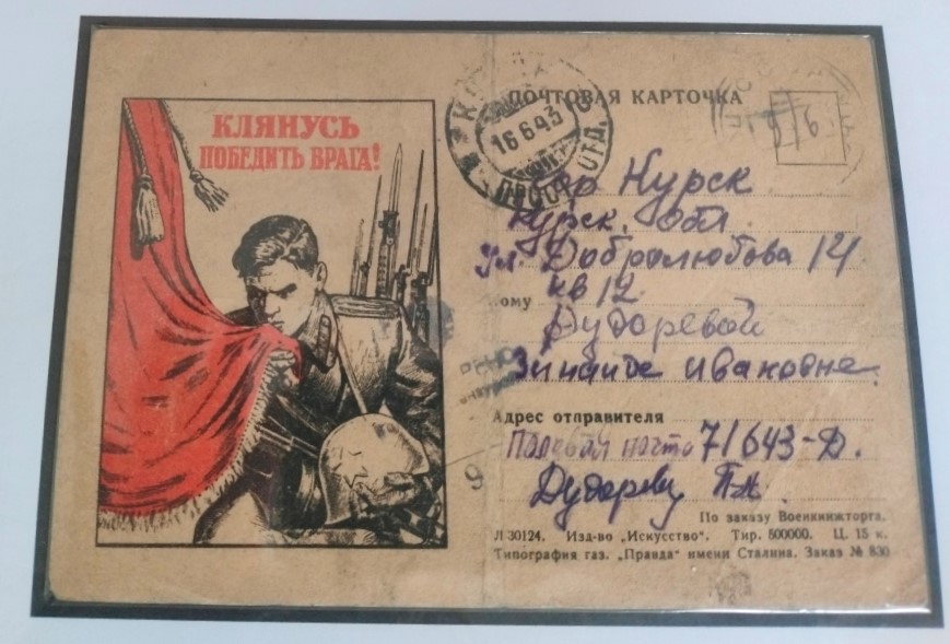 Кроме того, на выставке можно увидеть два редких экспоната: почтовую карточку, отправленную из Курска в Белоруссию 21 июня 1941 года за несколько часов до начала войны, и конверт с оттиском почтового штемпеля 22 июня 1941 года.