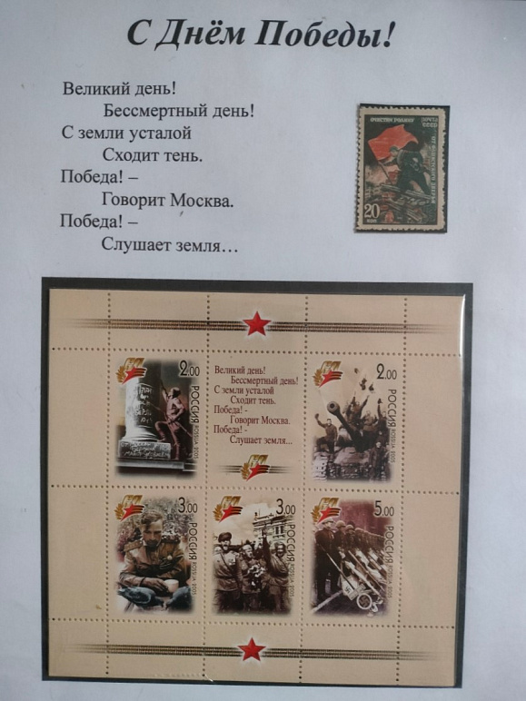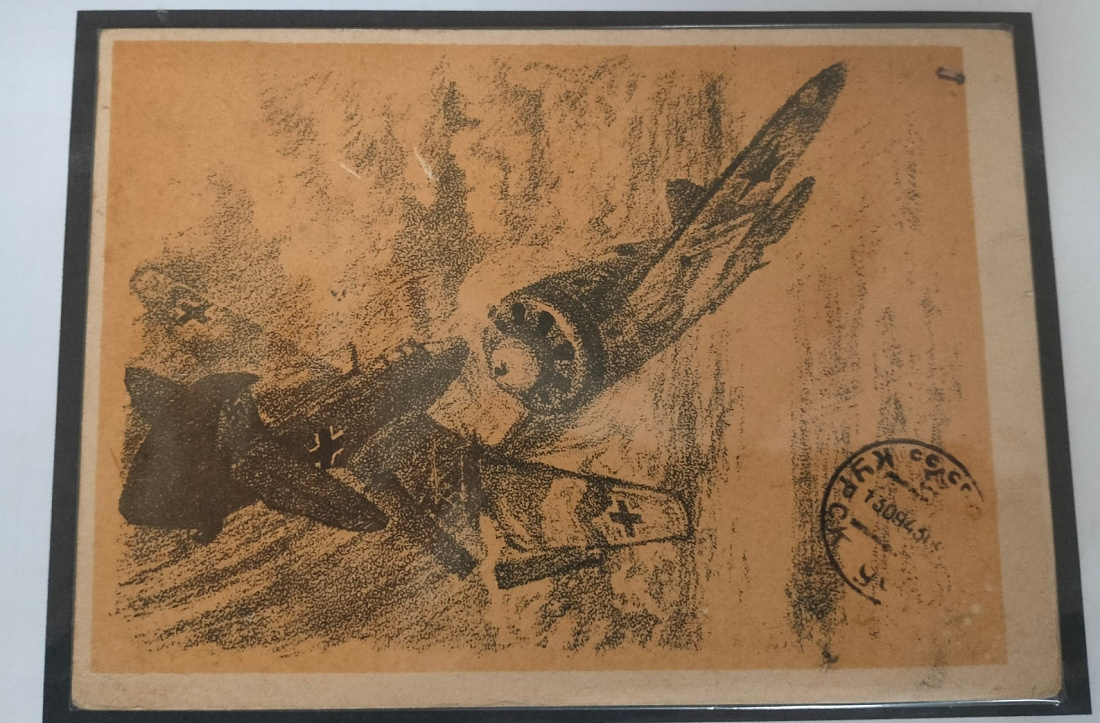 Отдельный блок посвящен подвигам наших героических земляков. На одном из выставочных листов наряду с почтовой карточкой 1943 года с изображением воздушного боя советского и вражеского самолетов размещен современный почтовый блок, посвященный Герою Советского Союза Екатерине Зеленко, женщине-летчице, первой в мире совершившей воздушный таран.