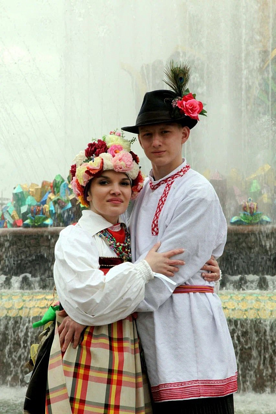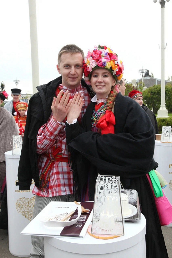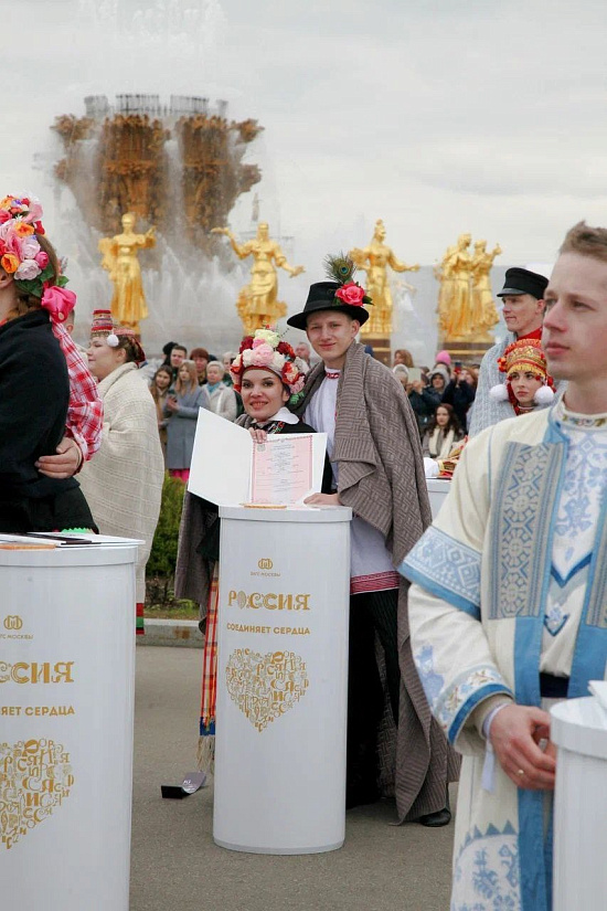 12 мая в Москве на выставке-форуме «Россия» прошла самая массовая церемония бракосочетания в стране. Одновременно на ВДНХ был зарегистрирован брак 151 пары. Многие молодожены для церемонии бракосочетания выбрали традиционные костюмы своих регионов.