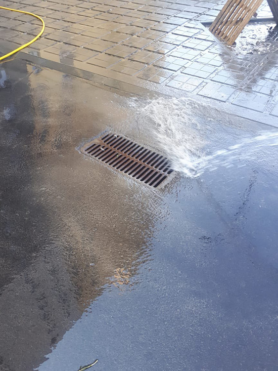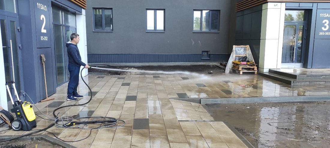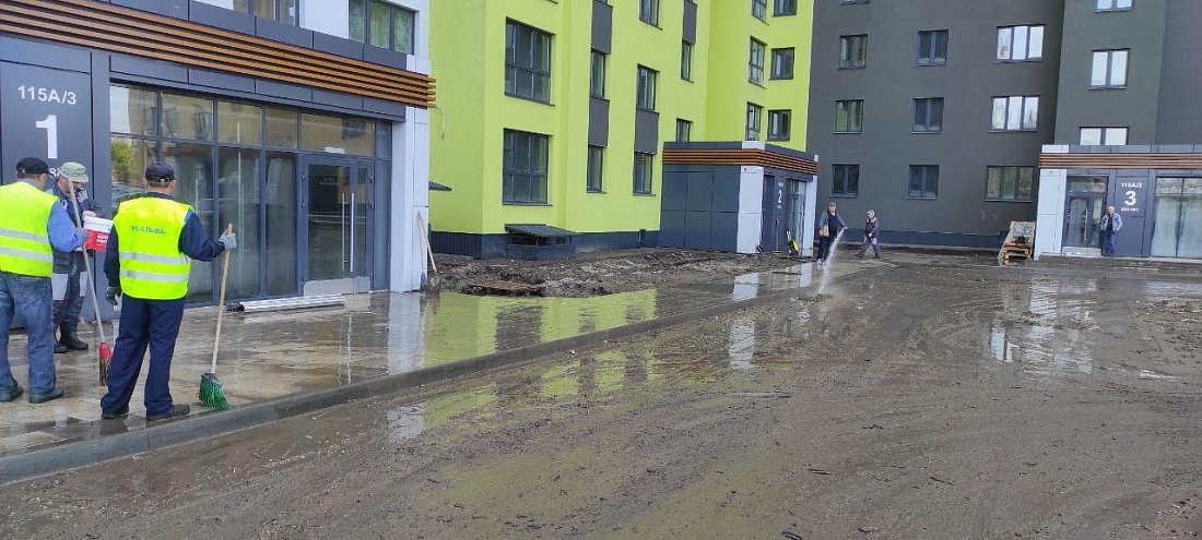 Наведен порядок на придомовой территории, вымыты тротуары и автопарковки. На газон, который был размыт мощным потоком воды, завезут новый грунт. Ливневая канализация во дворе дома очищена от мусора и в настоящий момент находится в рабочем состоянии. Для предупреждения подобных ситуаций будут установлены дополнительные барьеры из асфальта на территории строительной площадки для отсечения водного потока с улицы Ольшанского.