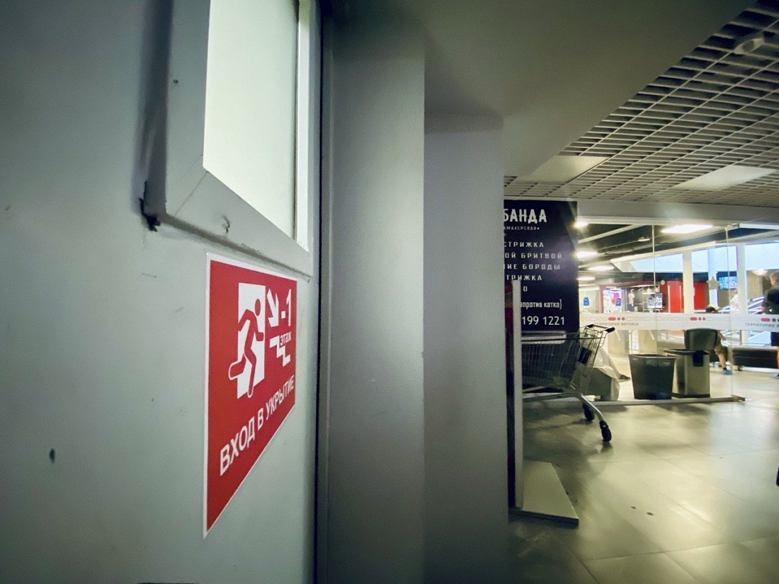 Самые безопасные места в торговом центре – минусовой этаж и другие помещения с несущими стенами без окон. Руководство «МегаГРИННа» поясняет, что двери при сигнале «Ракетная опасность» не должны быть открытыми, как при пожаре, потому что людям не рекомендуется выходить на улицу.