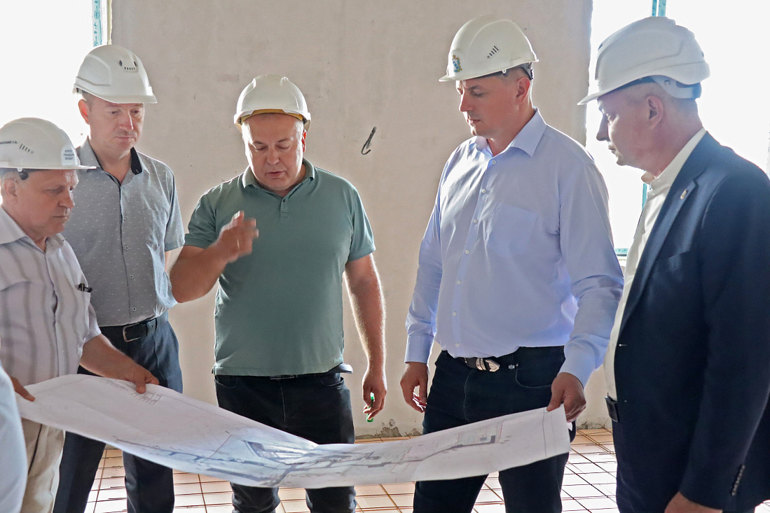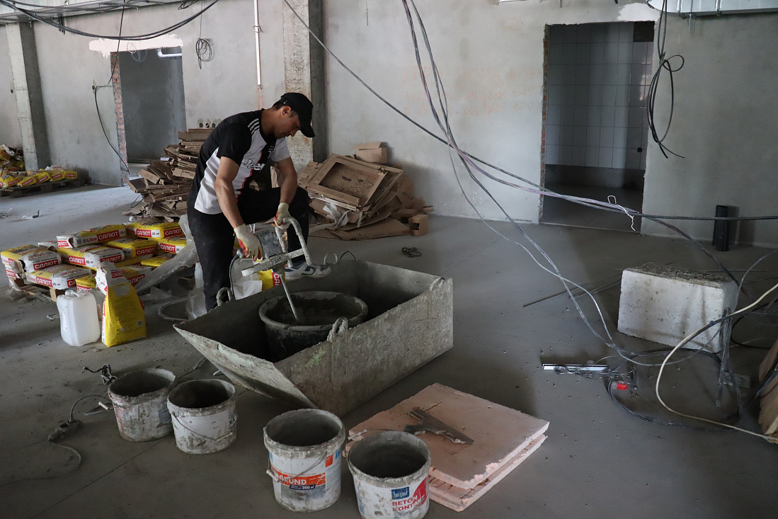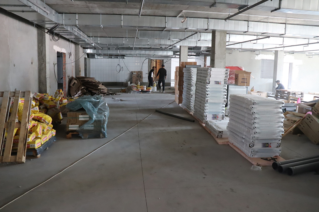 В некоторых помещениях уже ведется облицовка стен керамической плиткой. Завершены работы по прокладке наружных коммуникаций. Также подрядная организация приступила к планировке территории и подготовке к благоустройству.