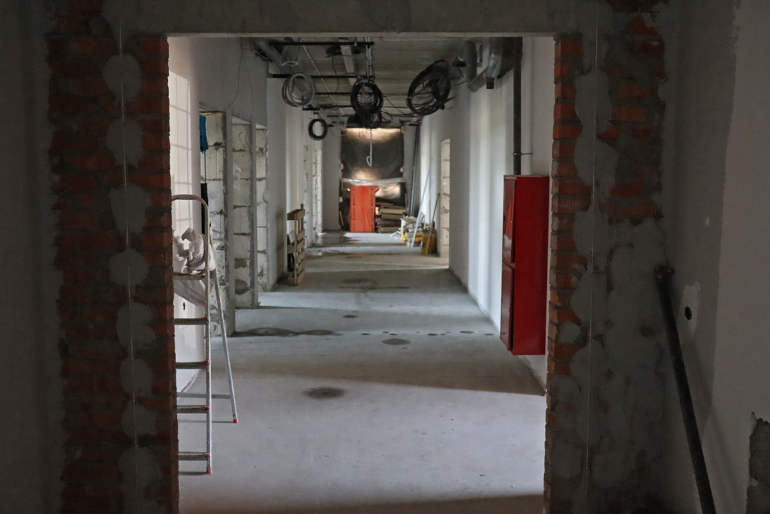 На сегодняшний день в жилых и административном корпусах будущего дома-интерната ведутся прокладка и устройство инженерных сетей и коммуникаций, кровельные работы. Оштукатурены стены коридоров и комнат, завозятся материалы.