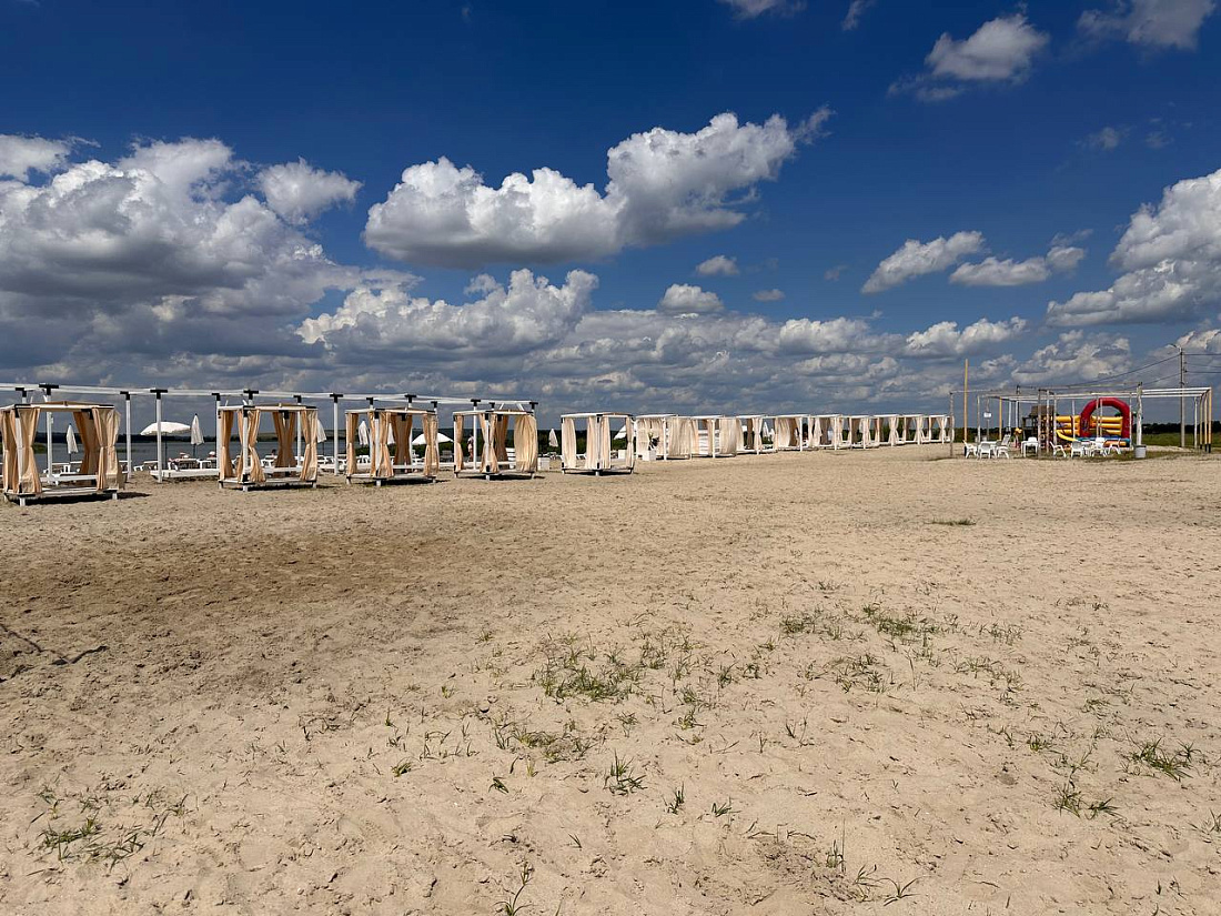 Благодаря федеральной субсидии на пляж завезли речной песок, разместили шезлонги, лежаки, столики и пляжные зонты. Для маломобильного населения установлена раздевалка. Также здесь построили понтон и волейбольную площадку, создали детскую площадку с батутом.