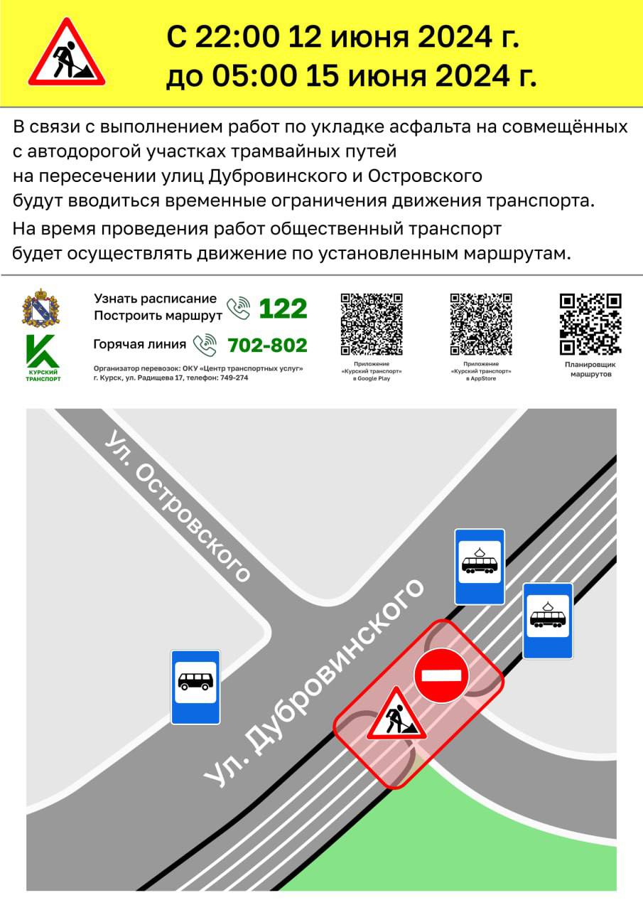 С 22:00 12 июня до 05:00 15 июня подрядная организация запланировала укладку асфальта на совмещенных с автодорогой участках трамвайных путей на пересечении улиц Дубровинского и Островского.