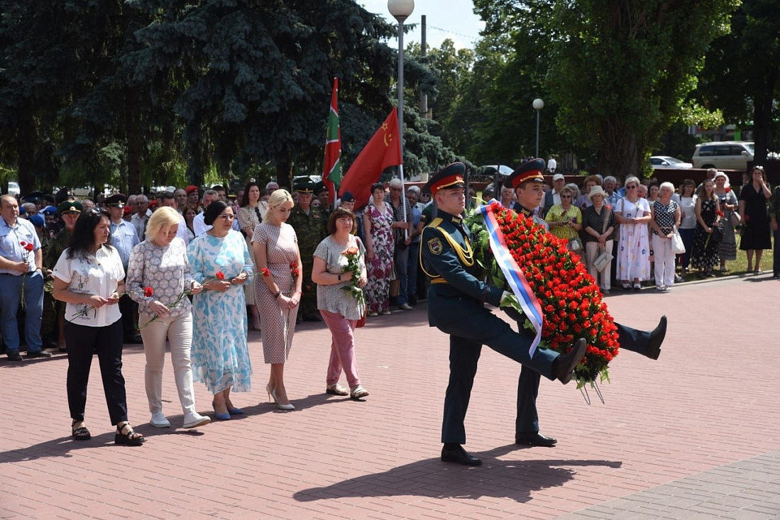 В Георгиевском сквере Курска состоялась церемония возложения цветов и венков к памятнику «Скорбящая мать», приуроченная ко Дню ветеранов боевых действий.