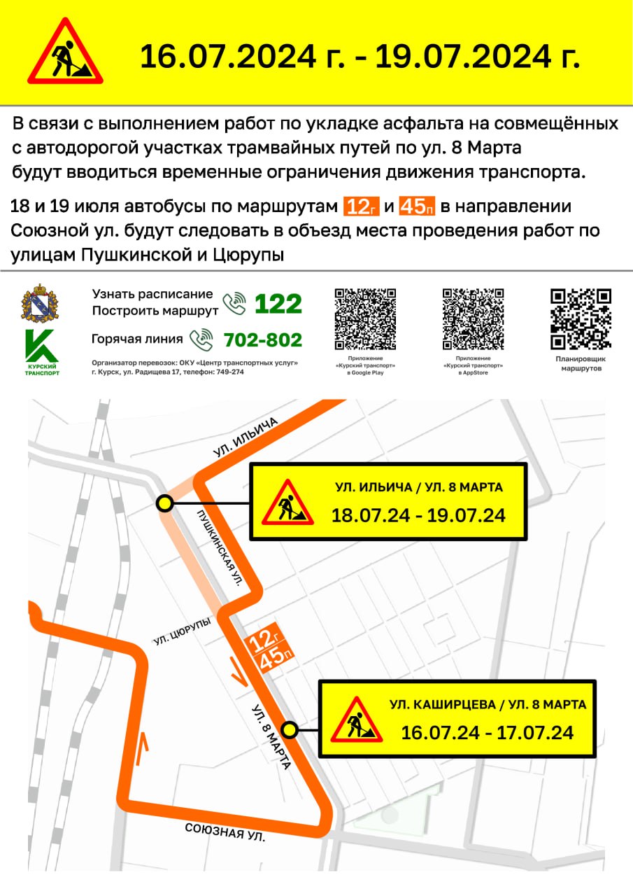 Во время работ временно изменится схема движения общественного транспорта. Автобусы по маршрутам 12г и 45п в направлении улицы Союзной будут следовать по улицам Пушкинской и Цюрупы.