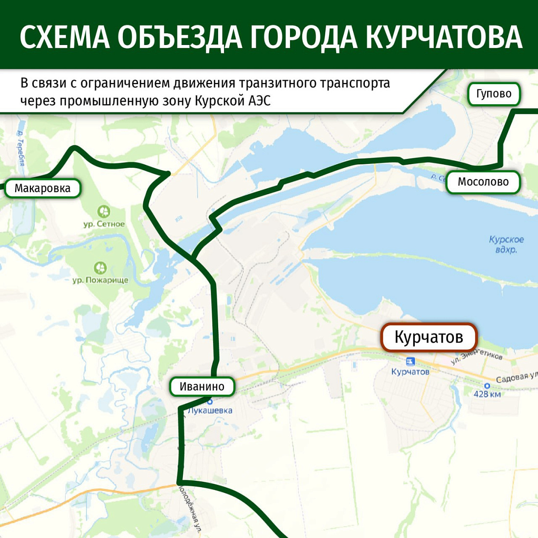 Схема объезда города Курчатова в связи с ограничением движения транспорта через промзону Курской АЭС