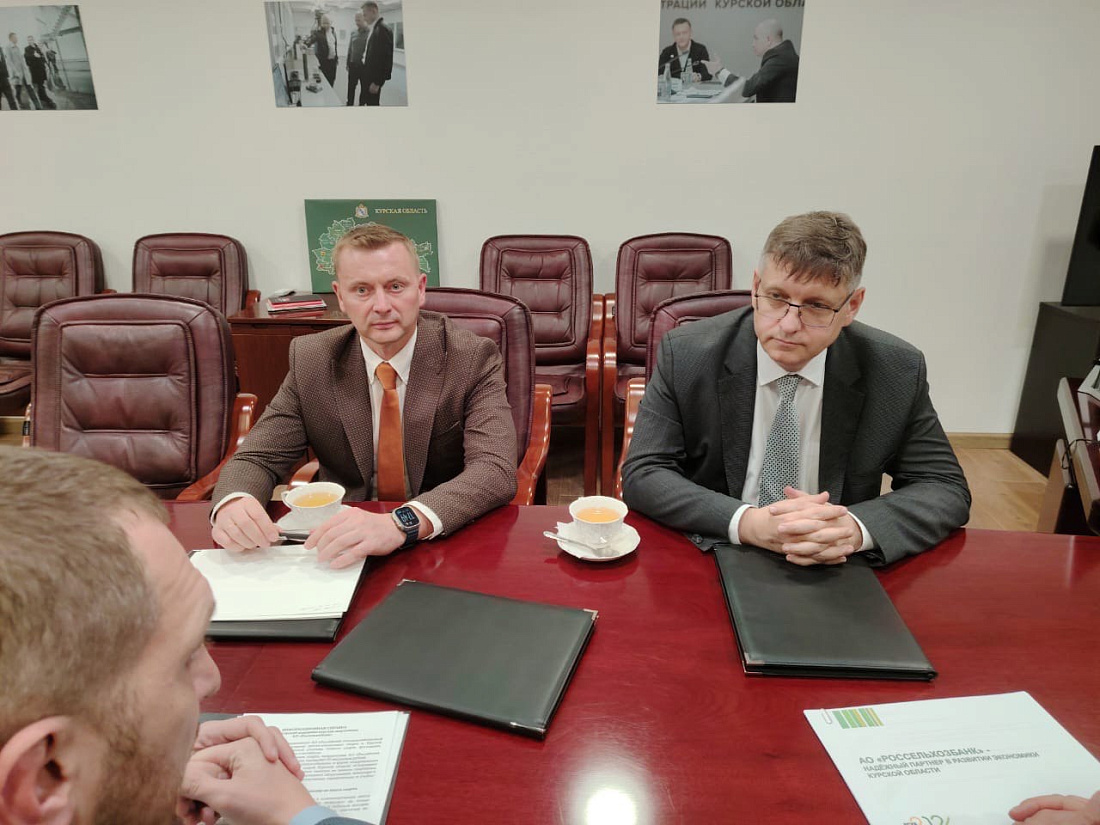 В областном центре прошла встреча заместителя губернатора Курской области Сергея Стародубцева, министра сельского хозяйства региона Натальи Гончаровой и и.о. министра спорта Курской области Вячеслава Харитонова с заместителем председателя правления Россельхозбанка Денисом Константиновым и заместителем директора Курского регионального филиала Россельхозбанка Михаилом Скибиным.