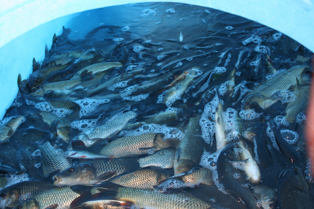 В поселке Медвенка в пруд выпустили молодь толстолобика и сазана